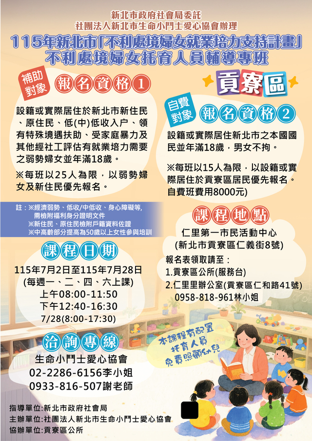 115年新北市「不利處境女性就業培力支持服務開辦坐月子及托育人員輔導專班」