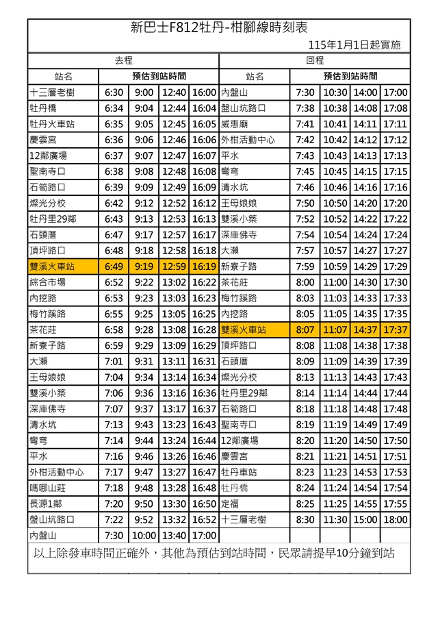 新巴士F812牡丹-柑腳線時刻表