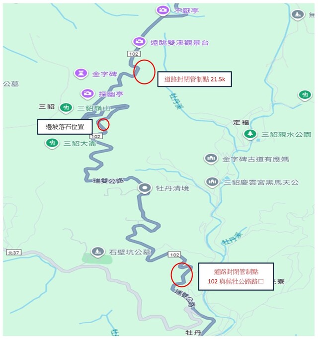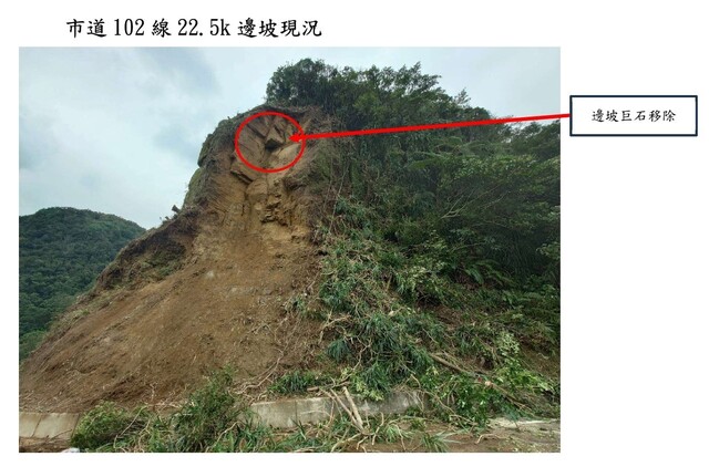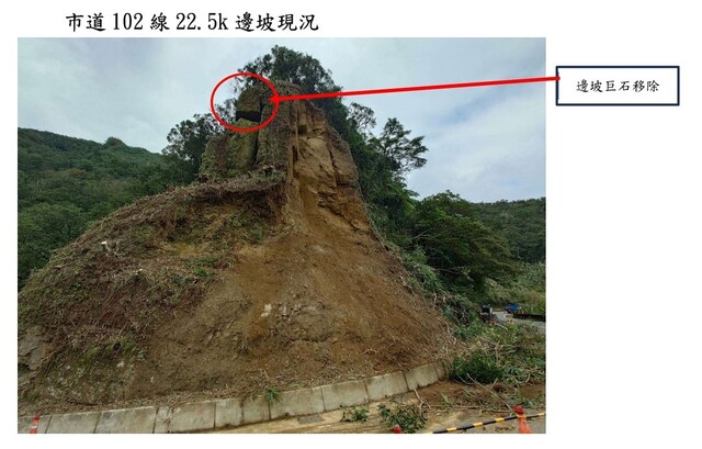 有關市道102線22.5k處邊坡落石,道路雖經搶通,惟邊坡仍有巨石有墜落之疑慮,為避免影響用路人安全,本所預計於114年12月2日(星期二) 上午08:00起至12月4日(星期四)下午18:00止,於102線21.5K、北37線與102線口設立管制點,禁止車輛進出,辦理道路封路作業,造成不便,尚祈見諒。