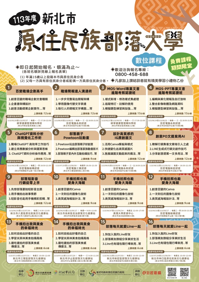 三、旨揭免費課程報名及相關資訊,請至本市部落大學網站最新消息下載或查詢(網址),或逕洽0800-458-688報名專線。